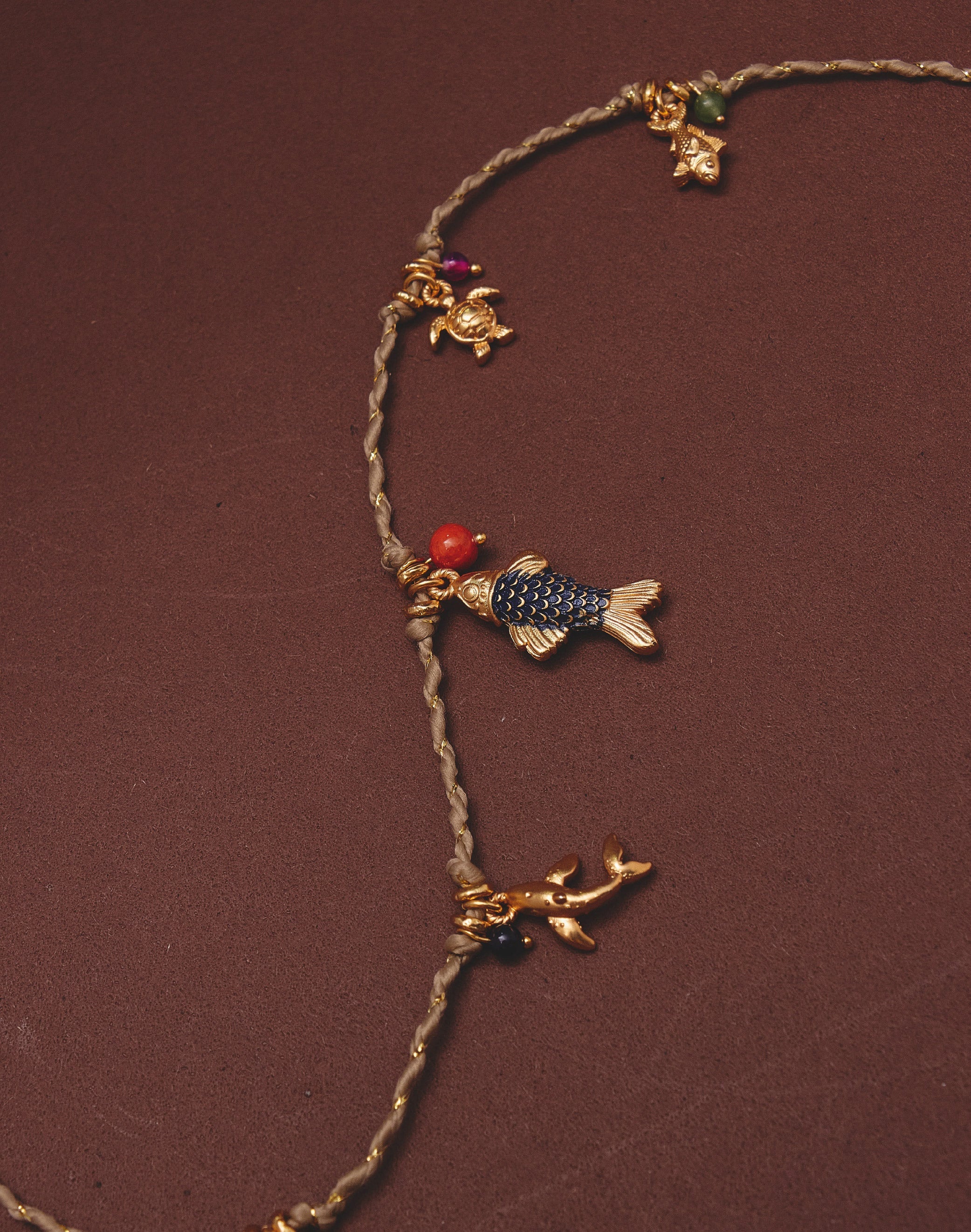 Un set que captura los colores cálidos del atardecer tropical del Pacífico. Este layering combina un collar corto con cordón lurex y múltiples dijes inspirados en la fauna marina, junto...